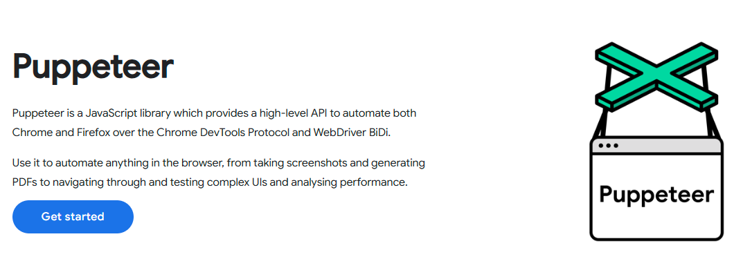 Puppeteer is a JavaScript library from Google that provides a high-level API for controlling Chrome and, more recently, Firefox (with some limitations). It excels at browser automation through code-driven interactions, defaults to headless mode, and offers granular control over web scraping operations.