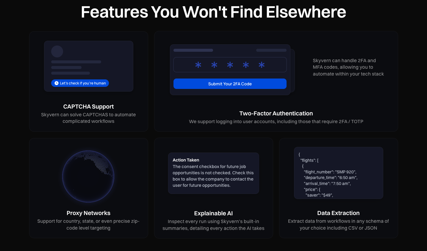 The system adapts automatically when sites update their layouts. No more broken scripts or emergency maintenance calls. Skyvern's AI understands form context and requirements, making intelligent decisions about data entry and validation.