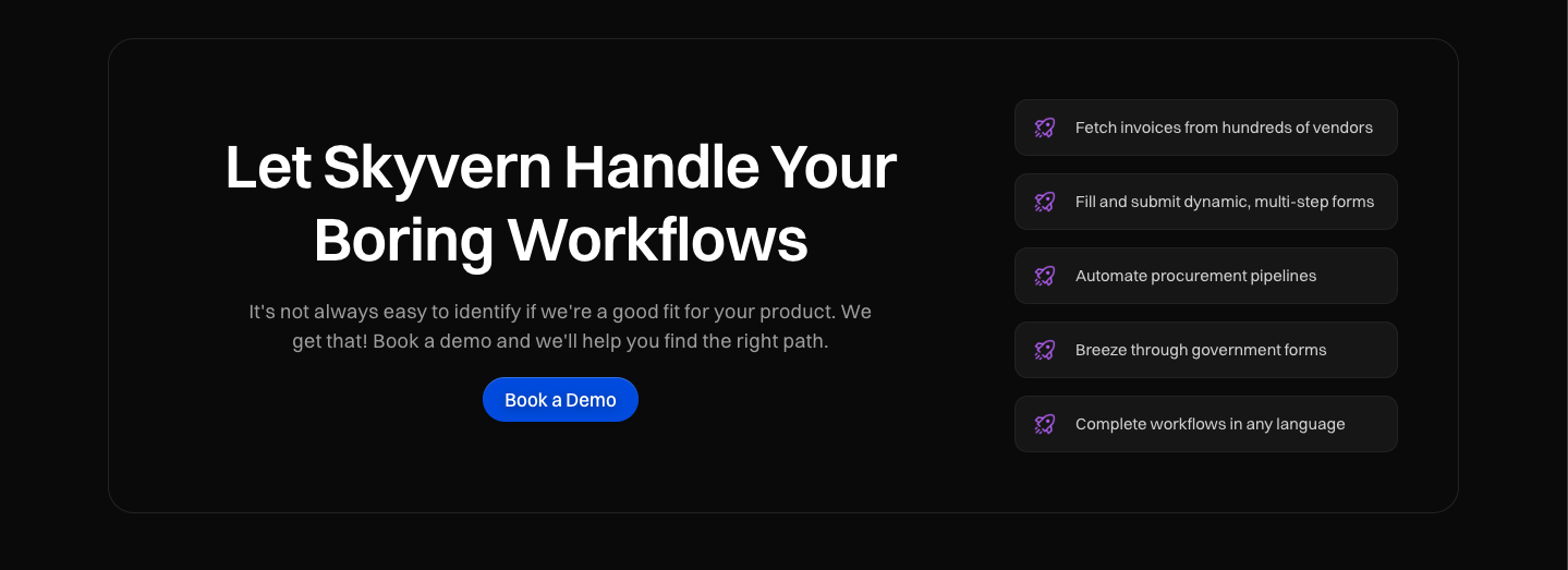 Skyvern eliminates these challenges through its LLM-powered approach. Instead of brittle scripts, it uses computer vision and natural language understanding to interact with government forms dynamically. A single workflow can handle multiple government websites without customization.